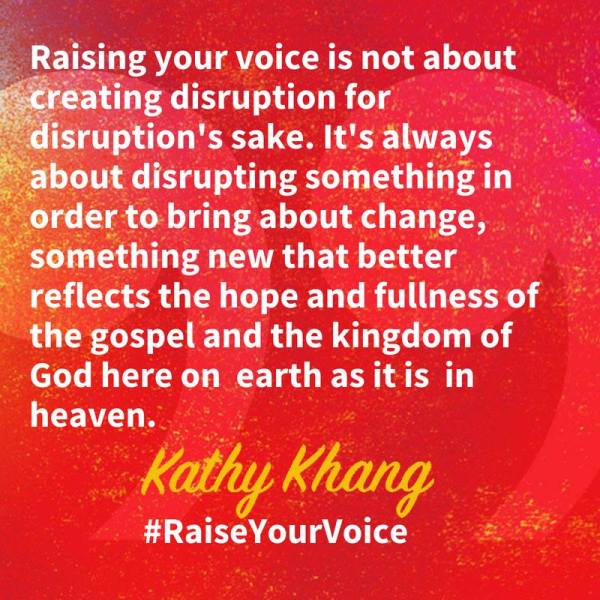 This is just one of the many reasons why I love Raise Your Voice: Why We Stay Silent and How to Speak Up by Kathy Khang (InterVarsity Press, 2018). Kathy shares out of her personal and ministry experience and from her reading of Scripture to offer encouragement and practical guidance on finding your voice and speaking up–not to be disruptive for its own sake, but as she says:
