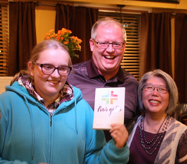 After my book talk and reading, we’re all smiles because getting a prize is always fun, plus Emma was drawing names for the giveaways, and just happened to draw her dad’s name for a copy of Four Gifts.