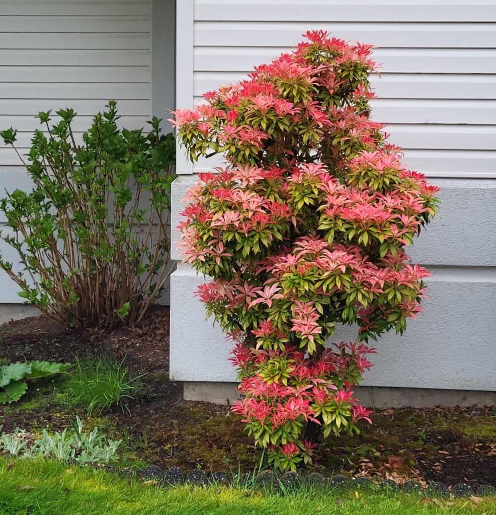 Of course, I recognized the large rhododendron bush by the front door, and the roses at the side of the house. But the fire-on-the-mountain bushes—more formally called pieris japonica—were new to me. How aptly named, I thought, for most of their leaves were dark green, but the new growth was a brilliant red, topping the plant like fire on a mountain.